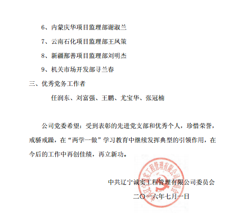 7月1日下午,公司黨委召開《慶祝建黨95周年暨“一優(yōu)兩先”表彰視頻大會》。主會場設在公司一樓會議室,中海油惠州項目監(jiān)理部黨支部、甘肅華亭項目監(jiān)理部黨支部、神華寧煤項目監(jiān)理部黨支部、煙臺萬華項目監(jiān)理部黨支部設立視頻分會場。黨委副書記馮玉琢主持了視頻大會。首先為新黨員中海油惠州項目監(jiān)理部黨支部的李婷婷舉行了入黨宣誓儀式,公司黨委委員劉興善同志宣讀了公司黨委對戰(zhàn)勝、吳琪轉(zhuǎn)為中共正式黨員的批復。公司黨委委員馬俊同志宣讀了“一優(yōu)兩先”表彰決定。黨委書記孫學良結(jié)合公司實際做了慶祝建黨95周年的講話。最后全體黨員重溫的入黨誓詞,進行入黨宣誓。