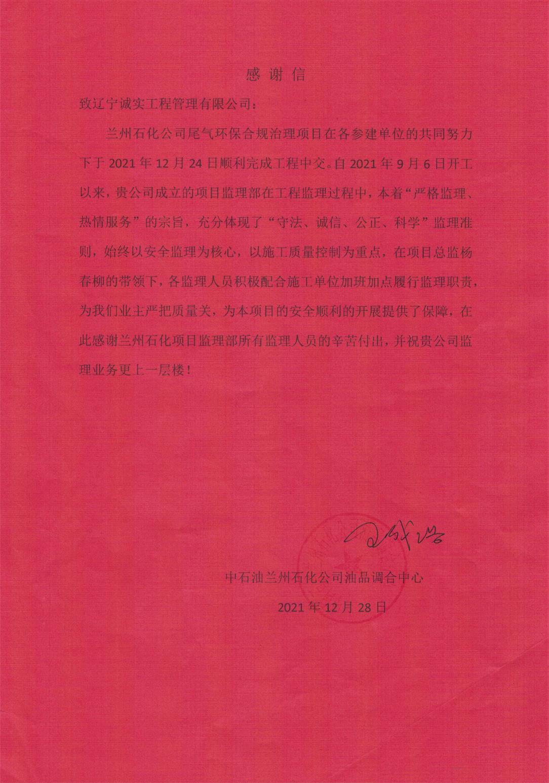 喜訊¦蘭州石化公司尾氣環(huán)保合規(guī)治理項目順利完成工程中交-項目部收到業(yè)主單位感謝信