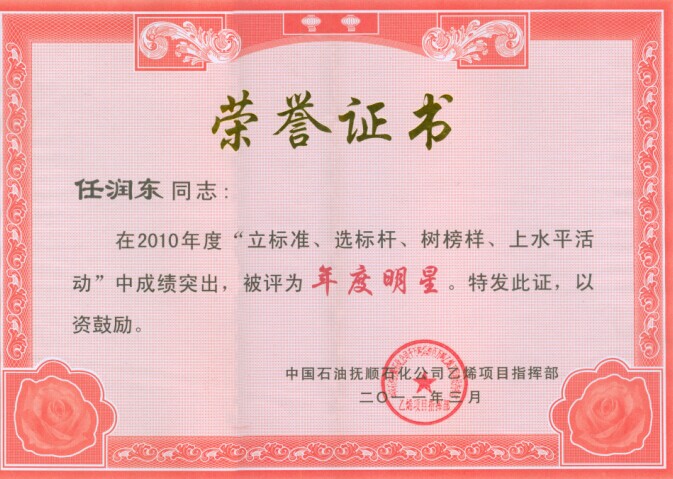 任潤(rùn)東同志被中國(guó)石油撫順石化公司乙烯項(xiàng)目指揮部評(píng)為年度明星